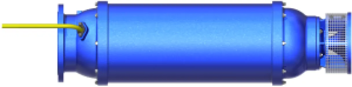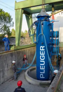 PLEUGER Bottom intake pump units are single or multi-stage centrifugal pumps, which are coupled with water-filled motors. The motor is arranged above the pump in a special bypass shroud and the pump intake is located in the lower part of the unit. The design allows to reduce the water line to a very low level. The pump units are available in standard configuration or according to special customer requirements such as operation in caverns.